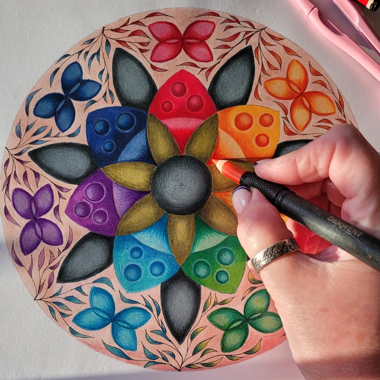 La gran mayoría piensa los Mandalas en pedacitos separados que hay que ir pintando, yo no lo pienso así.